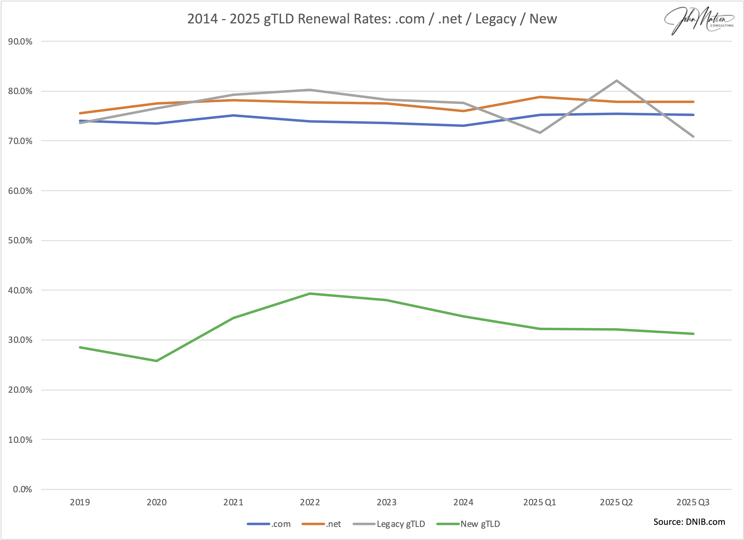 The graph below depicts the renewal rates for .com, .net, other Legacy gTLDs (.org, .travel, .coop, .museum and others) and the New gTLD group. The .com TLD shows steady growth progression in renewal rate from 74% in 2019 to 75% in 2025 while also growing DUM from 145M to 161M. The .net TLD shows a higher growth in renewal rate from 76 to 78% over the same timeframe. The .net increase is likely due to fewer new registrations that were captured by the introduction of the New gTLDs as .net DUM fell from 13.4M in 2019 to 12.5M in 2025.