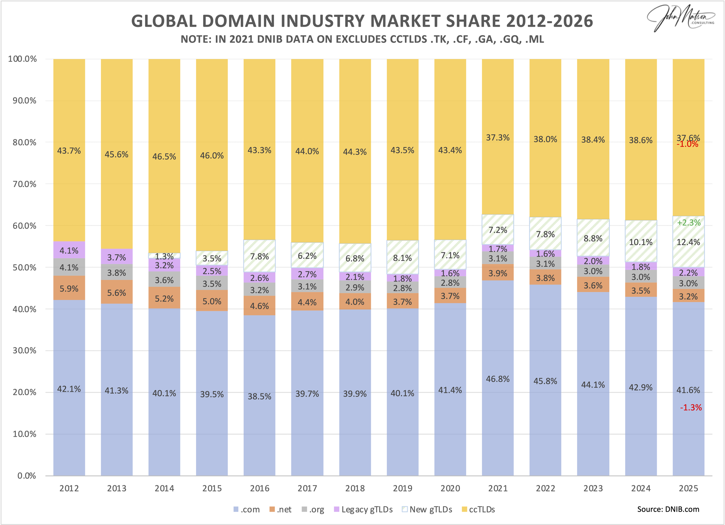 New gTLD’s took 2.3% market share in the global domain market in 2025 while .com lost 1.3% and ccTLDs lost 1.0%. However, it is important to note that .com returned to growth of 3% after two years of shrinking. We are heading toward the opening of the Next Round New gTLD application window in April 2026 and New gTLD growth in 2025 outperformed all other groups of TLD’s. Let’s take a deeper look at the numbers.