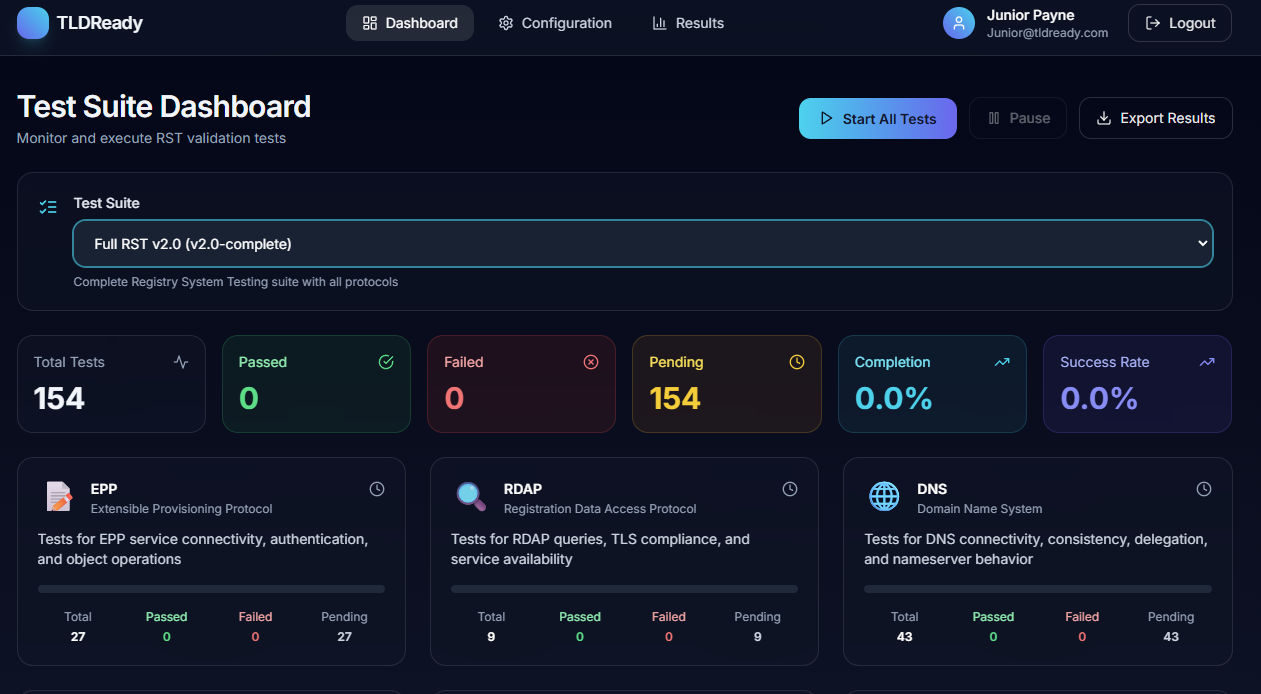 TLDReady.com provides an independent testing platform that applies the same functional expectations and measurement principles used in ICANN’s RST, allowing registry operators and Registry Service Providers to continuously validate system behavior as their platforms grow, change, and integrate new capabilities.