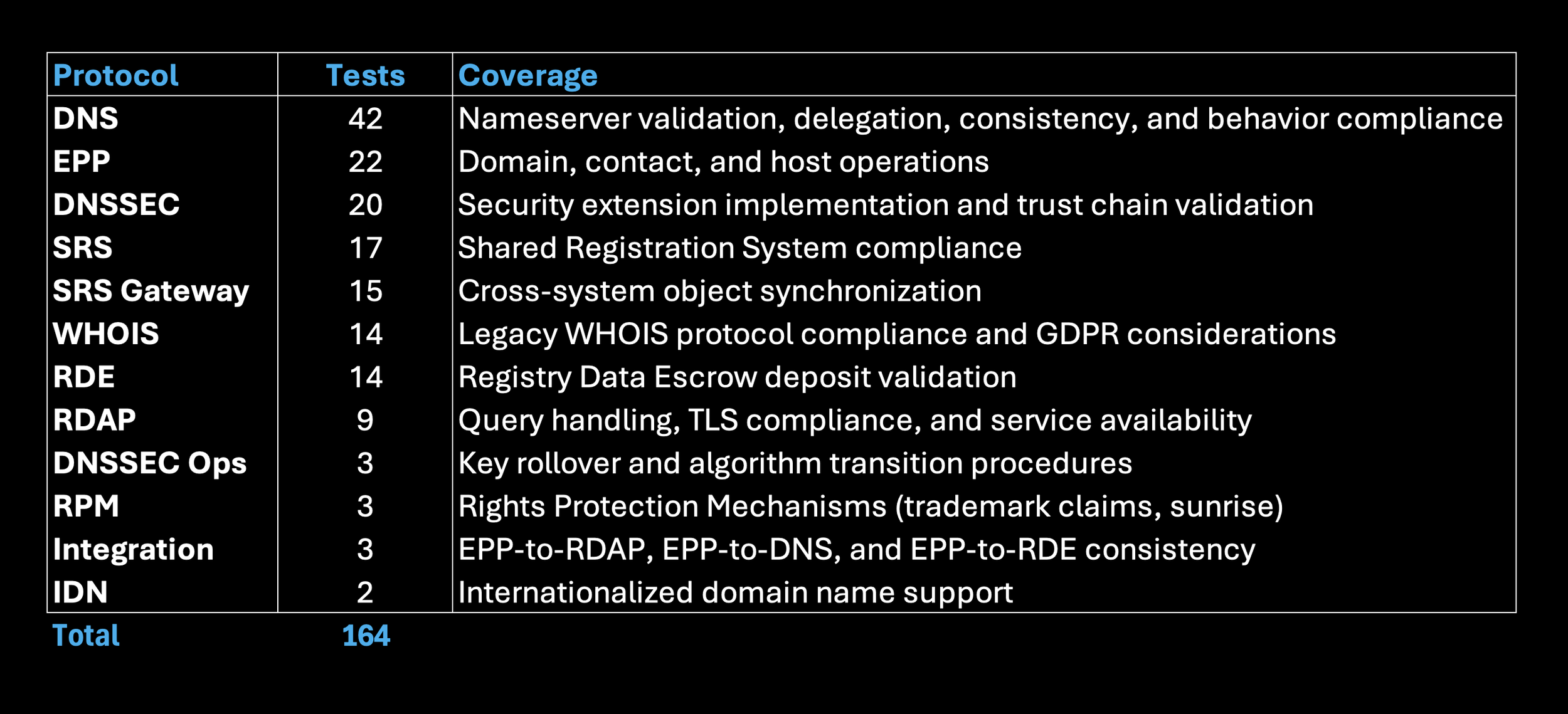 The readiness suite includes 164 structured tests across twelve critical protocol categories, providing broad validation of registry systems aligned with ICANN’s RST v2.0 expectations: