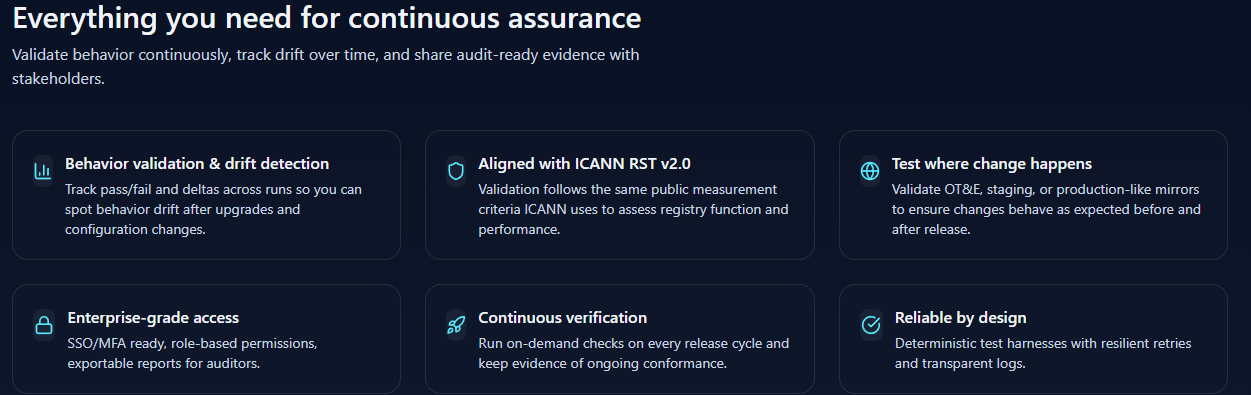 Rather than treating compliance as a one-time event, TLDReady supports ongoing operational discipline — helping registries ensure that system behavior remains aligned with ICANN standards throughout their lifecycle.